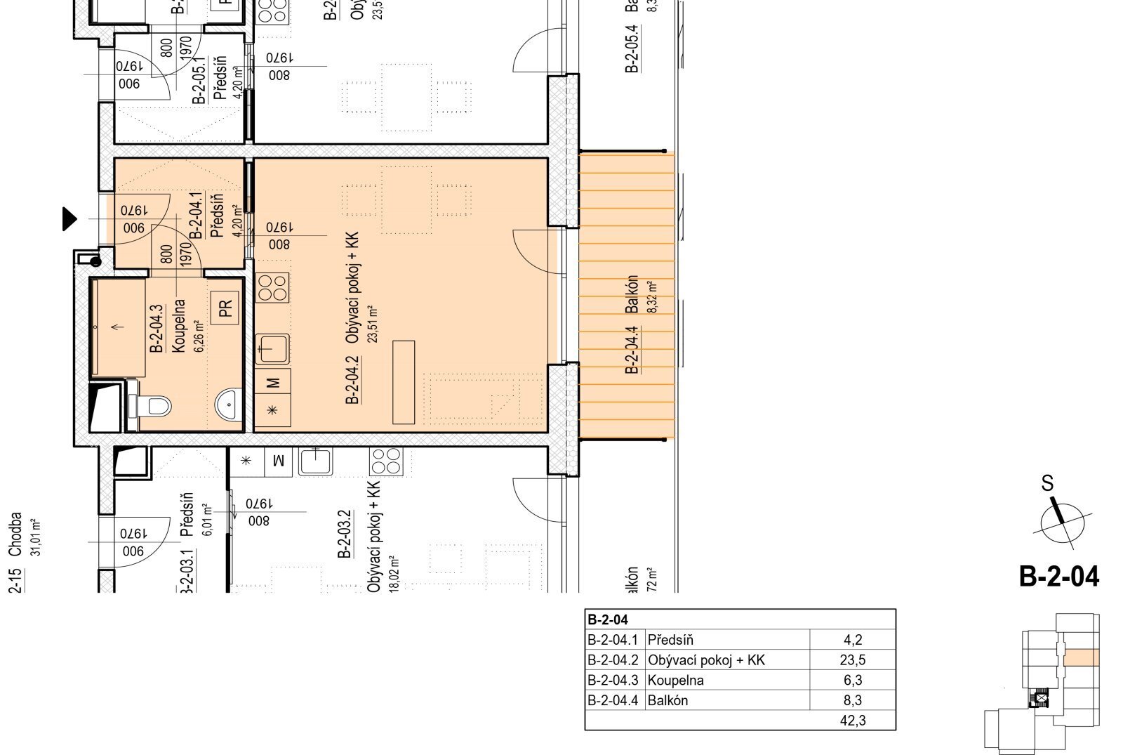 Byt 1+kk, 42,3 m2, 2. NP, budova B