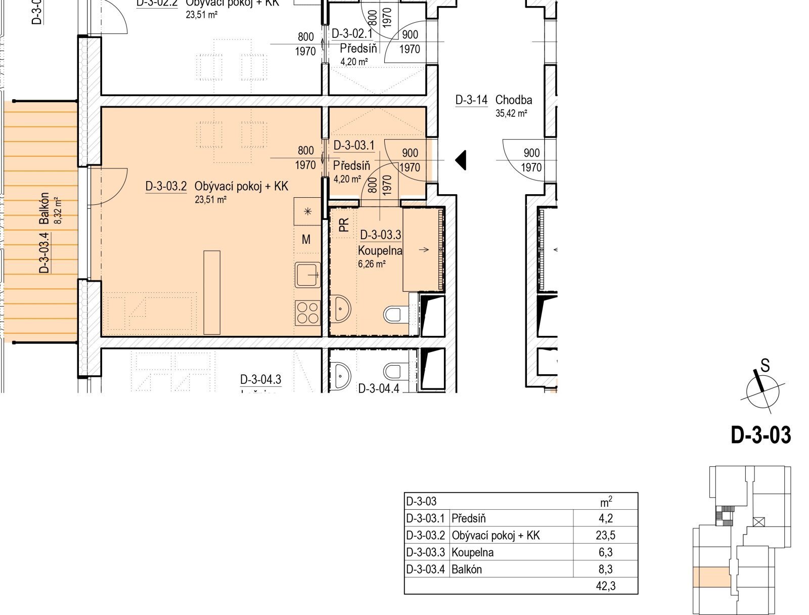 Byt 1+kk, 42 m2, 3. NP, budova D