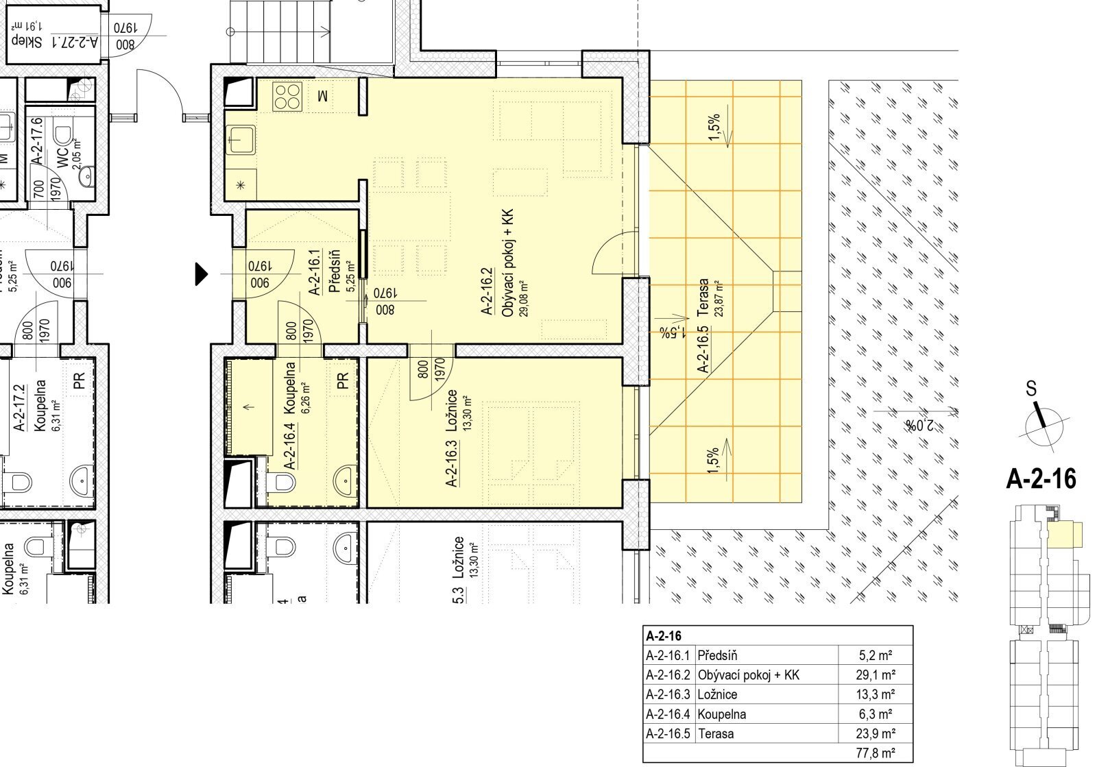Nabízíme k prodeji bytovou jednotku číslo A-2-16 v prémiovém komunitním bydlení pro seniory v projektu SENIOR RESORT HLUBOKÁ, jež je navržen podle aktuálních trendů moderního bydlení s důrazem na kvalitu a dlouhodobou udržitelnost budov. Jedná se o luxusní byt o dispozici 2+kk nacházející se ve 2. NP budovy A. Stejně tak jako všechny ostatní bytové jednotky je i tato koncipována jako bezbariérová. Její podlahová plocha činí 53,9 m2 a disponuje terasou o výměře 23,9 m2. Byt je orientovaný na východ. Bytovou jednotku tvoří: předsíň o výměře 5,2 m2, obývací pokoj s kuchyňským koutem o velikosti 29,1 m2, ložnice o výměře 13,3 m2 a koupelna s toaletou o výměře 6,3 m2. Dle přání lze dokoupit samostatnou sklepní kóji na patře.