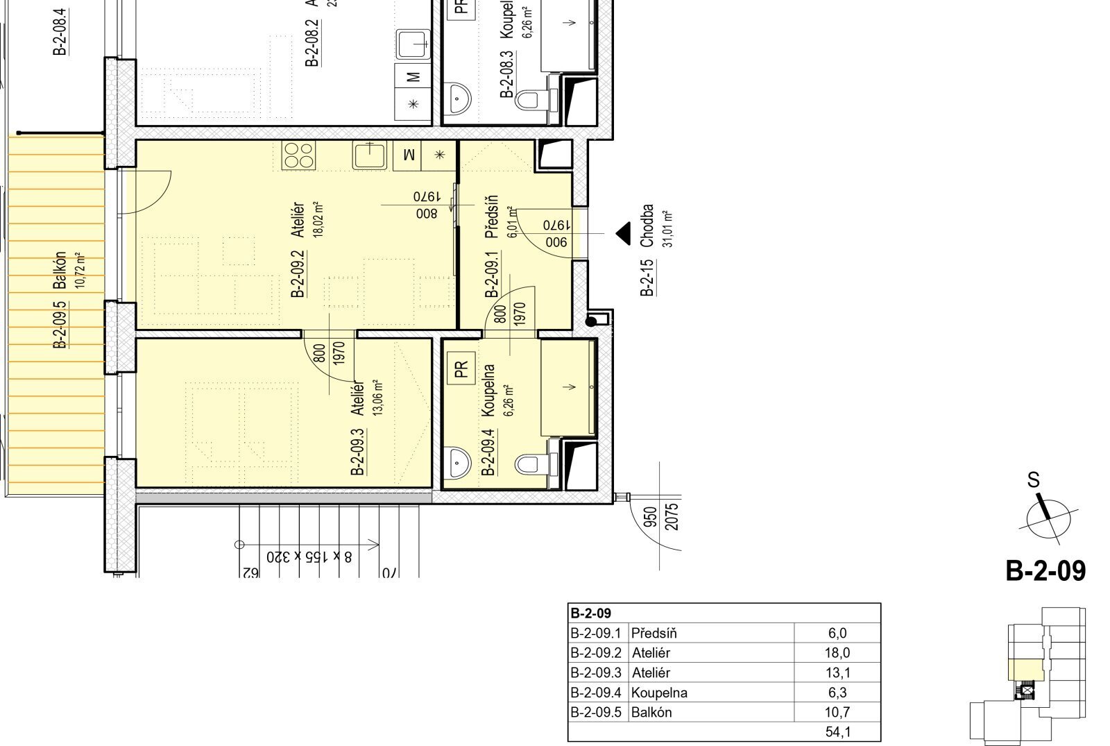 Bytovou jednotku tvoří: předsíň o výměře 6,0 m2, atelier o velikosti 18,0 m2, atelier o velikosti 13,1 m2 a koupelna s toaletou o výměře 6,3 m2. Dle přání lze dokoupit samostatnou sklepní kóji na patře.