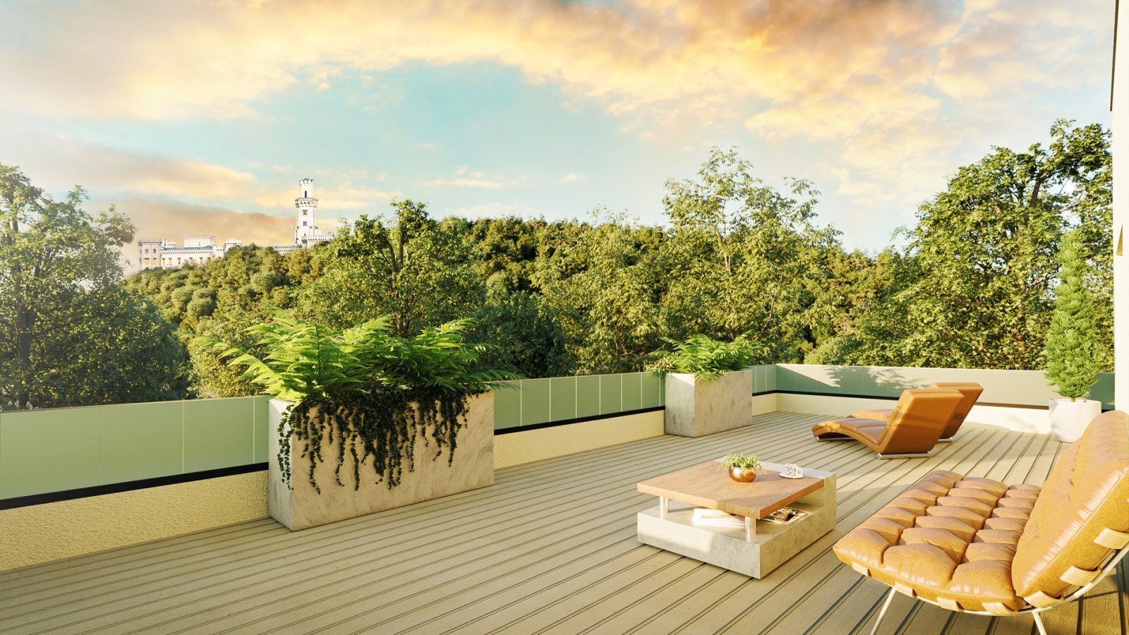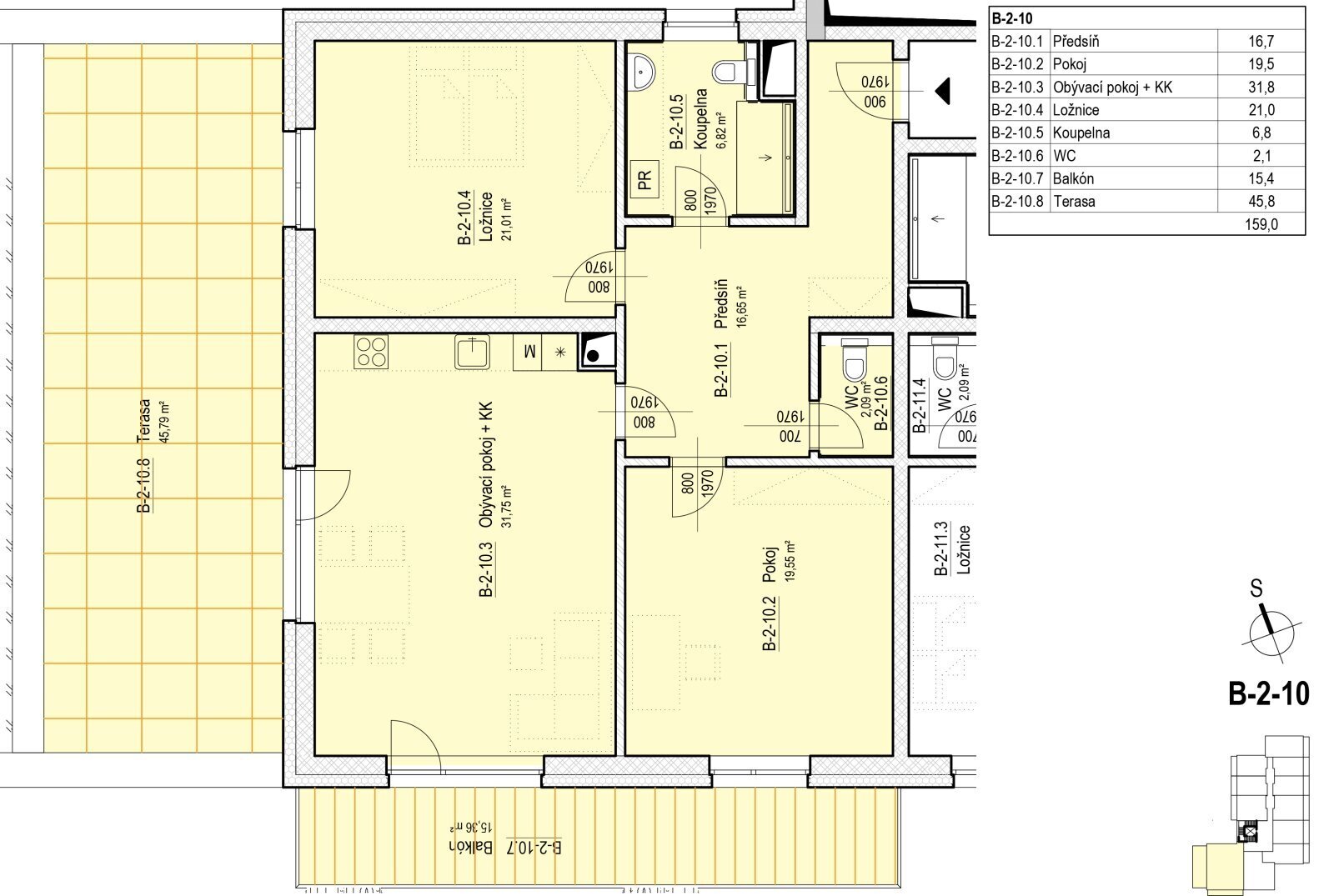 Nabízíme k prodeji bytovou jednotku číslo B-2-10 v prémiovém komunitním bydlení pro seniory v projektu SENIOR RESORT HLUBOKÁ, jež je navržen podle aktuálních trendů moderního bydlení s důrazem na kvalitu a dlouhodobou udržitelnost budov. Jedná se o luxusní byt o dispozici 3+kk nacházející se ve 2. NP budovy B. Stejně tak jako všechny ostatní bytové jednotky je i tato koncipována jako bezbariérová. Její podlahová plocha činí 98,2 m2 a disponuje po celé délce bytu terasou o velikosti 45,8 m2 s orientací na západ a balkonem s jižní orientací o výměře 15,4 m2. Bytovou jednotku tvoří: předsíň o výměře 16,7 m2, pokoj o velikosti 19,5 m2, obývací pokoj s kuchyňským koutem o velikosti 31,8 m2, ložnice o výměře 21,0 m2, koupelna s toaletou o výměře 6,8 m2 a samostatné WC o velikosti 2,1 m2. Dle přání lze dokoupit samostatnou sklepní kóji na patře.